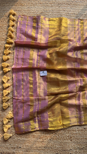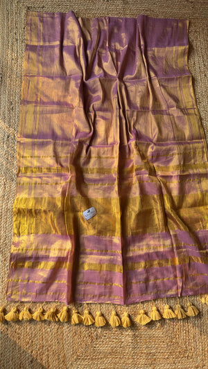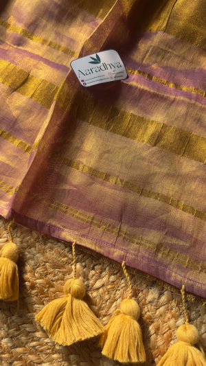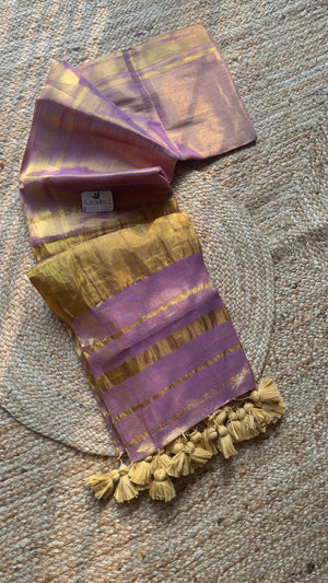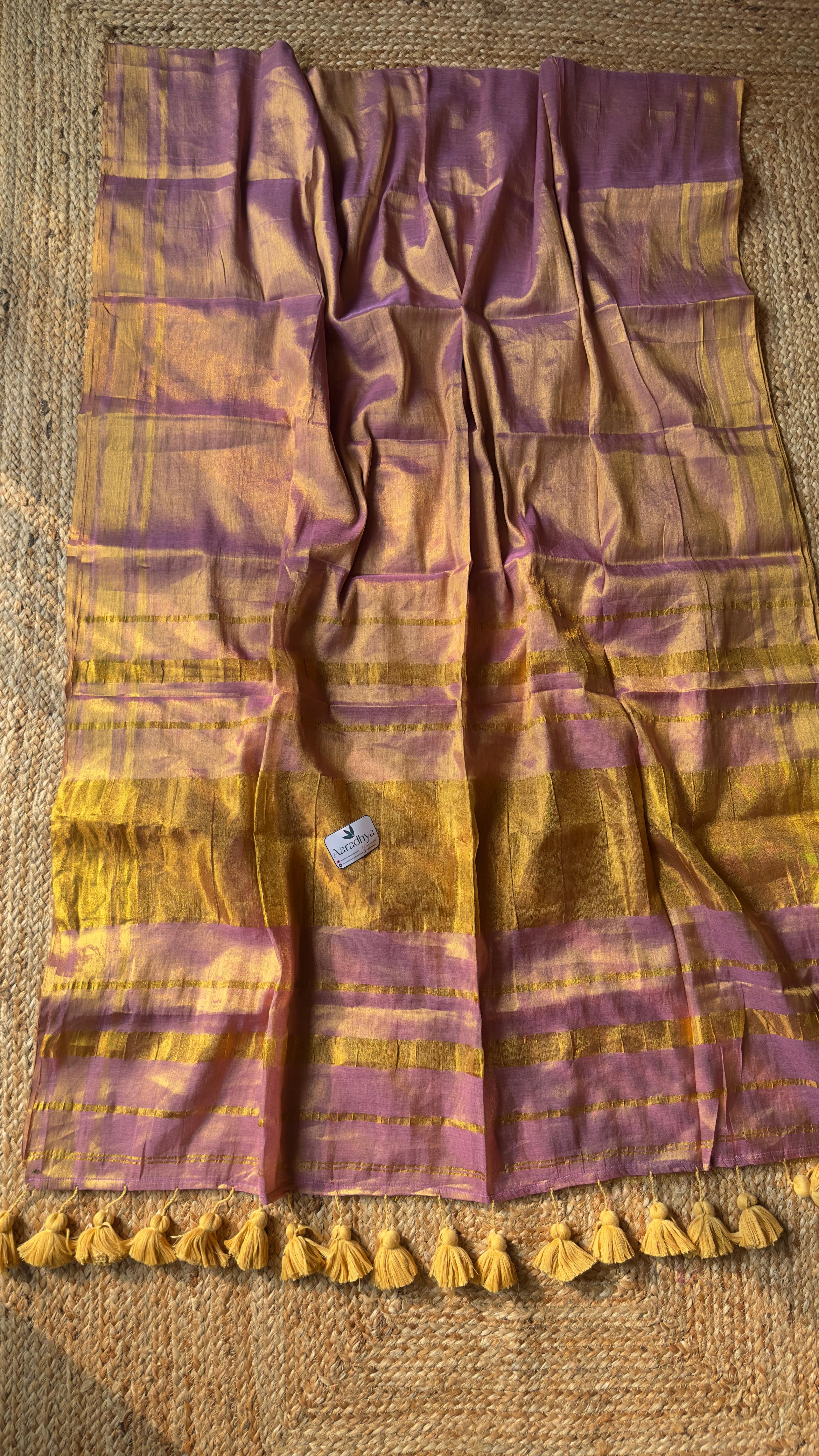 Onam tissue saree with a subtle sheen, beautifully highlighted by a rich golden pallu for a timeless, elegant look. Perfect for festive and wedding wear. Comes with huge tassels
