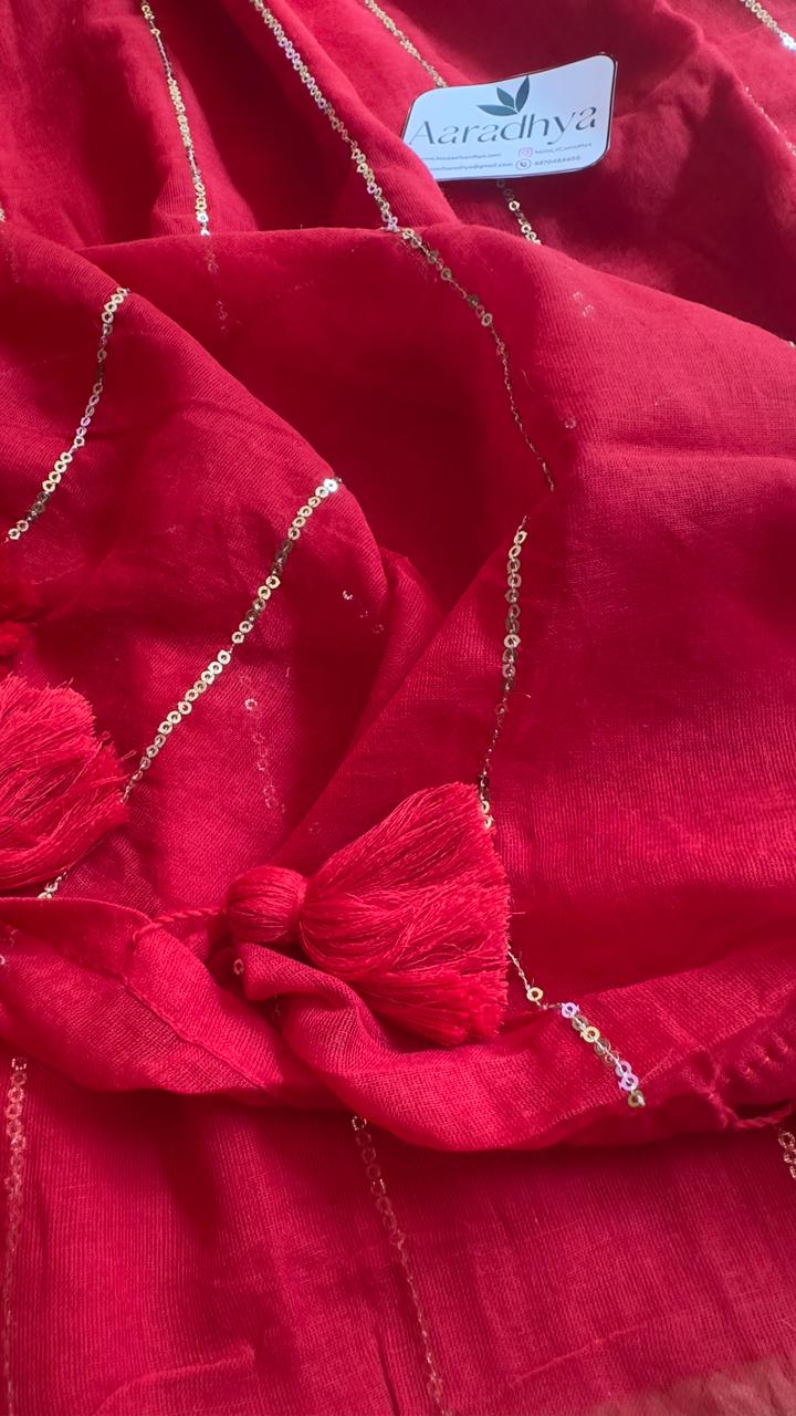 Intricate all-over sequin stitching lends a refined texture and fluid drape, blending classic tradition with modern elegance for effortless wear. Woven from pure 120 thread count Mul Cotton, this saree feels exceptionally soft, light, and breathable.